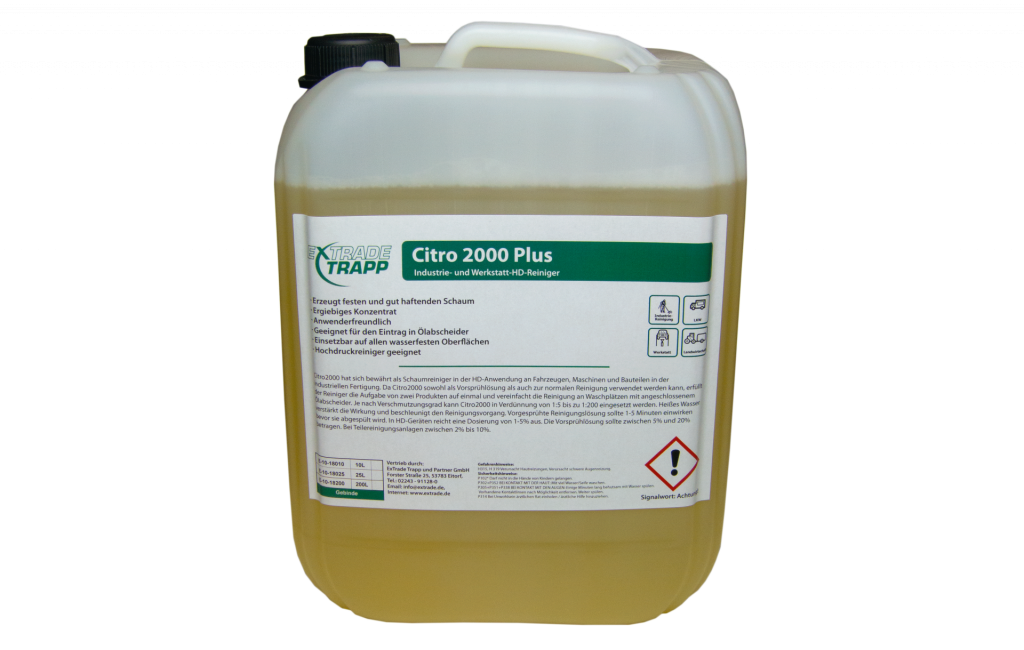 Citro2000 hat sich bewährt als Schaumreiniger in der HD-Anwendung an Fahrzeugen, Maschinen und Bauteilen in der industriellen Fertigung. Da Citro2000 sowohl als Vorsprühlösung als auch zur normalen Reinigung verwendet werden kann, erfüllt der Reiniger die Aufgabe von zwei Produkten auf einmal und vereinfacht die Reinigung an Waschplätzen mit angeschlossenem Ölabscheider. Je nach Verschmutzungsgrad kann Citro2000 in Verdünnung von 1:5 bis zu 1:200 eingesetzt werden. Heißes Wasser verstärkt die Wirkung und beschleunigt den Reinigungsvorgang. Vorgesprühte Reinigungslösung sollte 1-5 Minuten einwirken bevor sie abgespült wird. In HD-Geräten reicht eine Dosierung von 1-5% aus. Die Vorsprühlösung sollte zwischen 5% und 20% betragen. Bei Teilereinigungsanlagen zwischen 2% bis 10%.