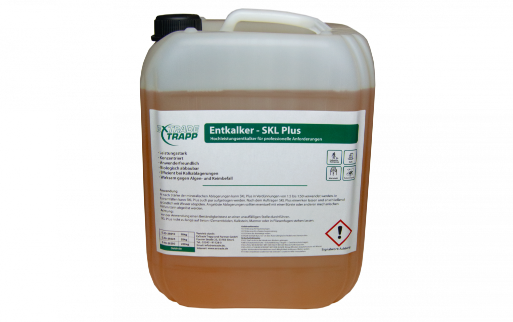 SKL Plus ist ein konzentrierter, leistungsstarker und sicherer Entkalker für den Einsatz in industriellen Anlagen und Großküchen. Mineralische Rückstände und hartnäckige Verkrustungen werden schonend und effizient von der Oberfläche entfernt. Aufgrund seiner speziellen Inhaltsstoffe entfernt er Kalk-, Oxid-, Mineralischerückstände, Urinstein, Zementschleier und Betonreste. Daher ist er auch sehr effizient beim Reinigen von Verschalungen im Baugewerbe. Auch Algen- und Keimbefall von Anlagen wird bekämpft.
