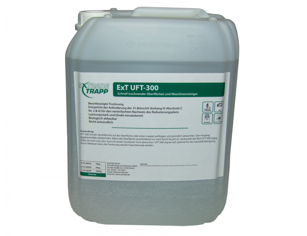 UFT-300 wurde speziell für unsere Kunden als Ersatzprodukt für stark lösemittelhaltige Reiniger konzipiert. Im Zuge der 31.BimschV (Lösemittelverordnung) und der europäischen Gesetzgebung müssen Unternehmen den Lösemittelverbrauch reduzieren und bestimmte Lösemittel-/VOC-Grenzwerte bei den eingesetzten Produkten einhalten. Zusätzlich sollen Produkte mit einer hohen Gefährdung für Menschen und Umwelt durch weniger gefährliche Produkte ersetzt werden. Für genau diese Aufgabe wurde UFT-300 entwickelt. Es sind weniger als 20% VOCs enthalten und entspricht somit den Vorgaben für Reinigungsmittel gemäß der Lösemittelverordnung. UFT-300 wird gebrauchsfertig geliefert und kann direkt eingesetzt werden. Es ist keine Verdünnung erforderlich.